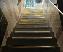 Способ монтажа: алюминиевый порожек без вставки крепится на ступени при помощи саморезов (идут в комплекте). Затем прорезиненную ПВХ вставку нужно нагреть строительным или обычным феном, либо подержать в горячей воде, чтобы материал стал мягче и легче вошел в паз профиля.